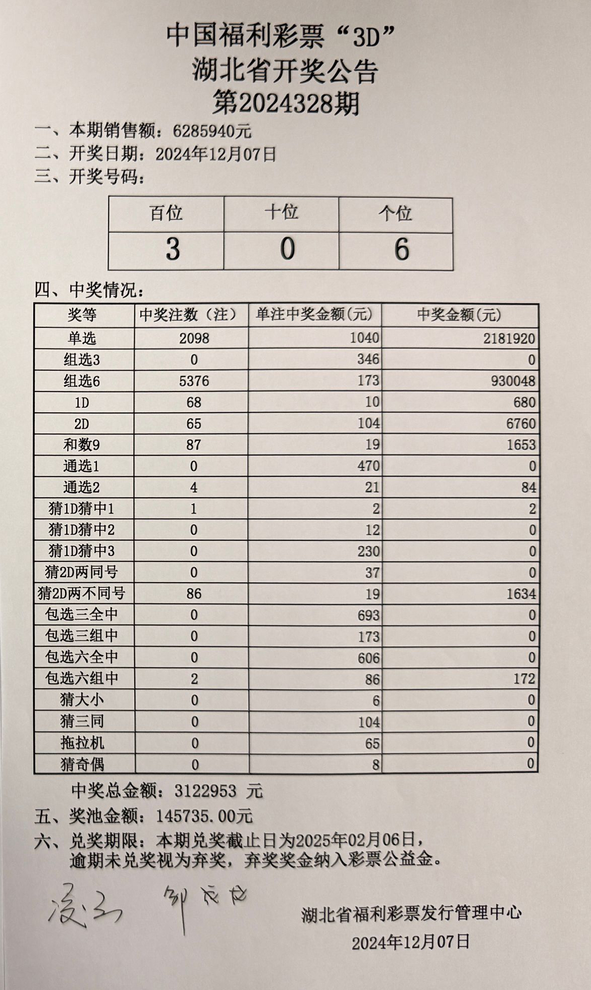 12月7日 福彩3D 开奖公告