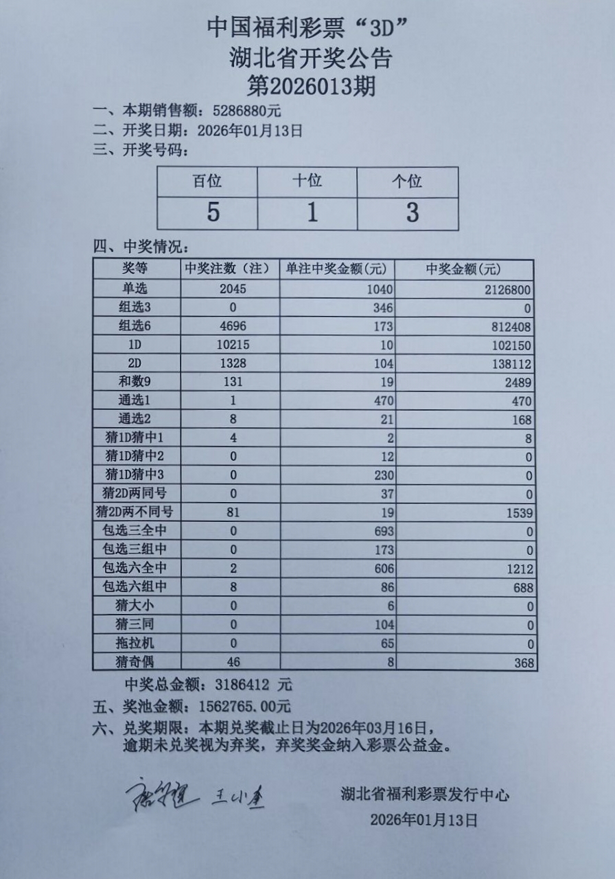 1月13日 福彩3D 开奖公告