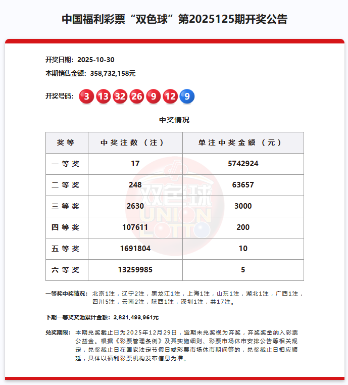 【双色球开奖综述】2025125期一等奖17注574万元(含湖北1注)