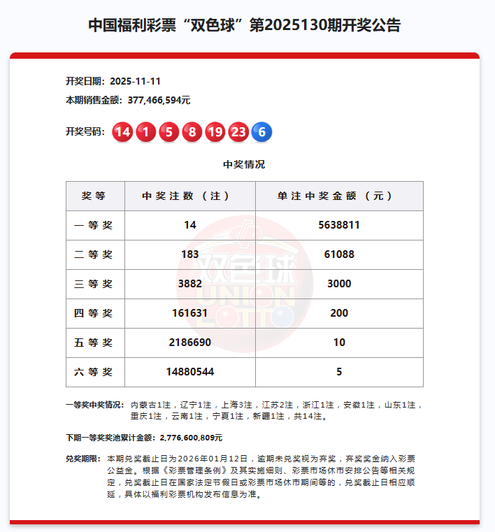 【双色球开奖综述】2025130期一等奖14注563万元