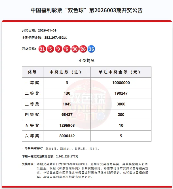 【双色球开奖综述】2026003期一等奖3注1000万元
