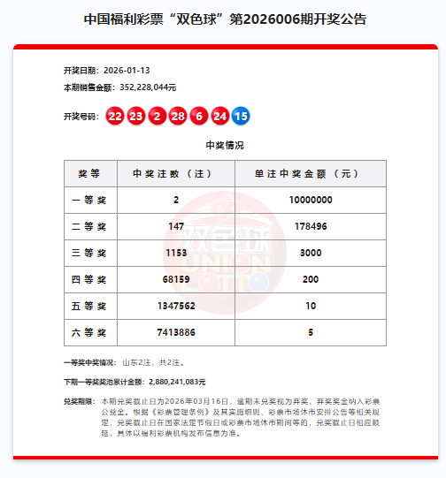 【双色球开奖综述】2026006期一等奖2注1000万元