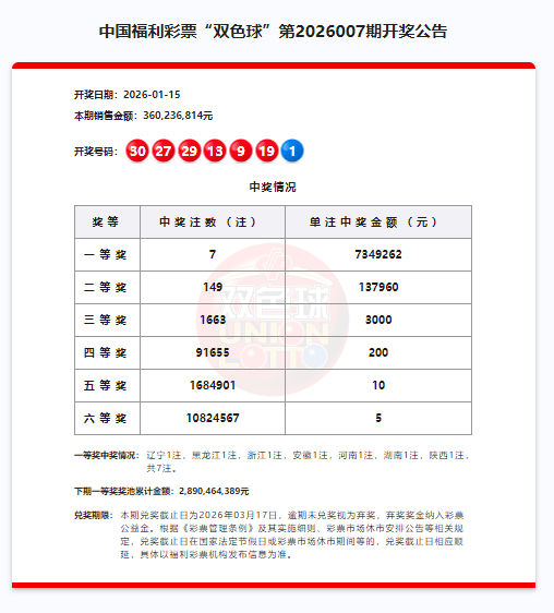 【双色球开奖综述】2026007期一等奖7注734万元
