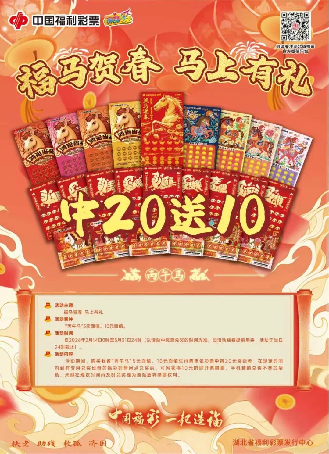(一)活动期间,对购买我省“丙午马”5元面值、10元面值即开型彩票,单张中得20元奖级者,在规定时间内到湖北省福彩投注站或有即开票扫描兑奖设备的销售网点兑奖后,可另获得10元任意面值即开票赠票。