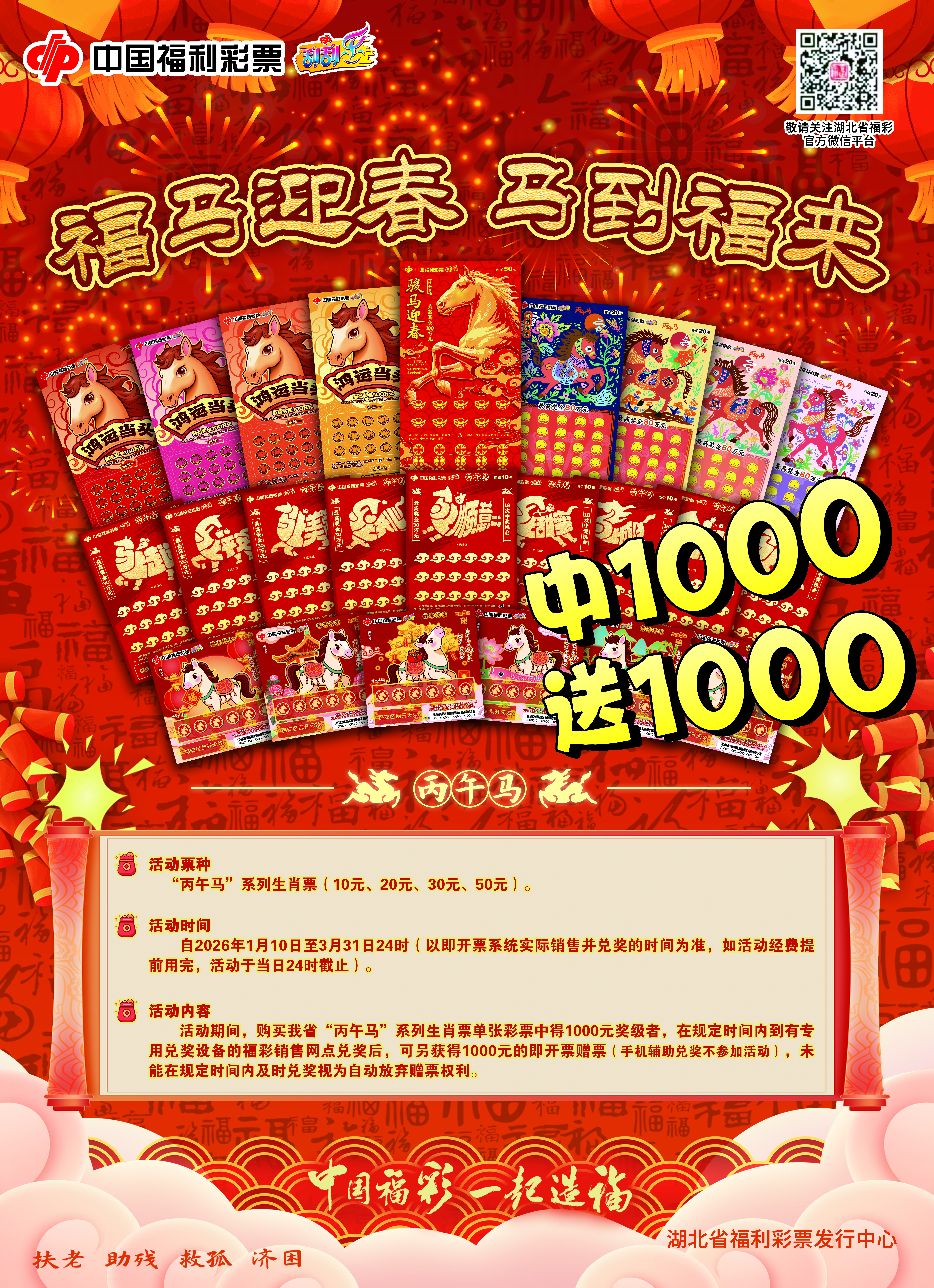 (一)活动期间,对购买我省“丙午马”5元面值、10元面值即开型彩票,单张中得20元奖级者,在规定时间内到湖北省福彩投注站或有即开票扫描兑奖设备的销售网点兑奖后,可另获得10元任意面值即开票赠票。