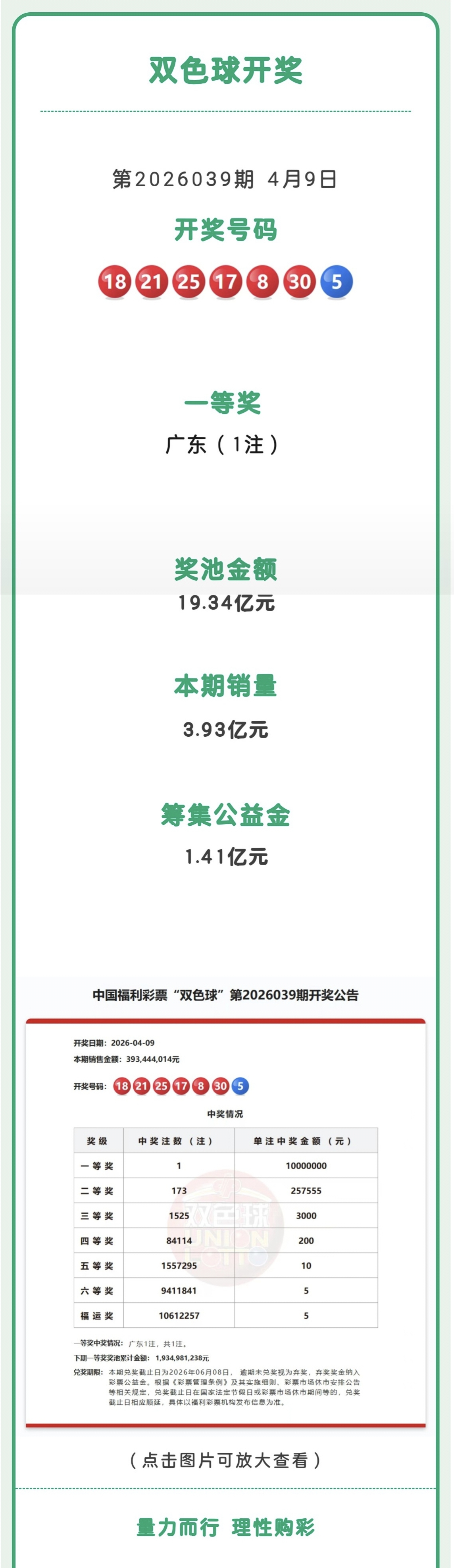 双色球第2026039期:中出一等奖1注,筹集公益金1.41亿元