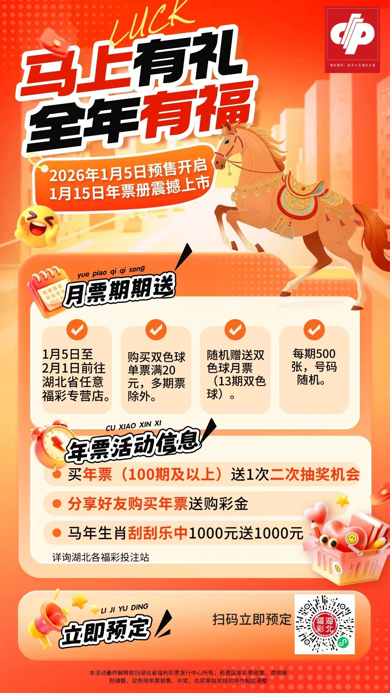 即开票加码:1月10日至3月31日,“购买湖北省"丙午马"系列10元、20元、30元、50元面值马年生肖即开票,单张中1000元奖级,可额外获赠1000元即开票(需在网点兑奖,手机辅助兑奖不参与)。