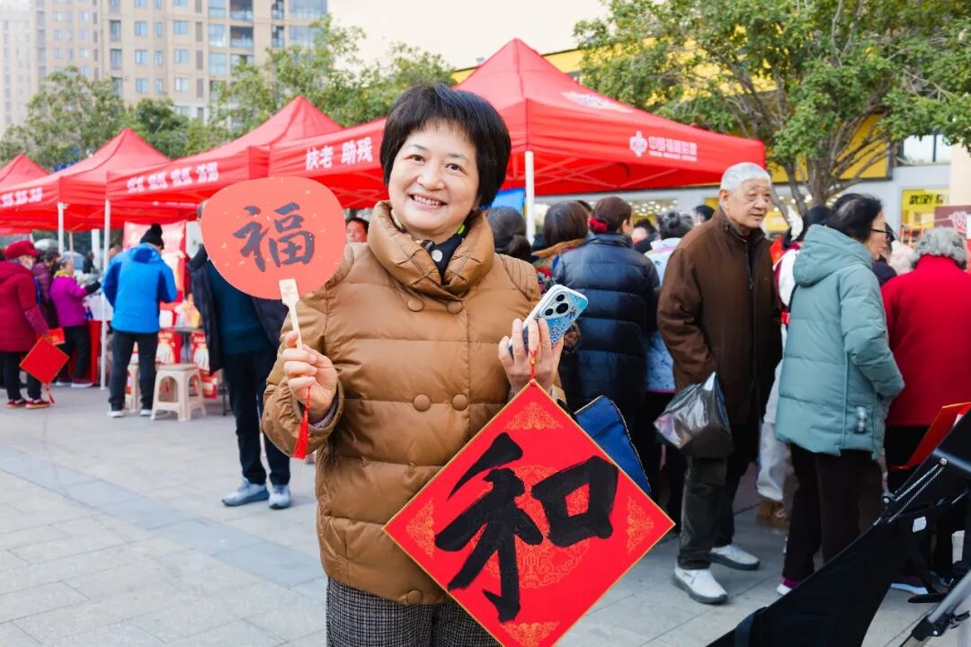 活动现场,居民们热情参与,感受十足的年味与暖意。“没想到在家门口不仅能拿到书法家手写的春联,还能顺便把地道的年货置办上,感觉提前过年了!”刚选购了炸圆子的社区居民李阿姨高兴地展示着手中墨迹未干的福字,“这个‘福’字写得真好,这个活动真贴心,既有文化味儿,又实在。”带着孩子前来参加活动的王先生则表示:“活动很丰富,孩子看了写毛笔字,也尝了传统小吃,感觉特别有意义。”