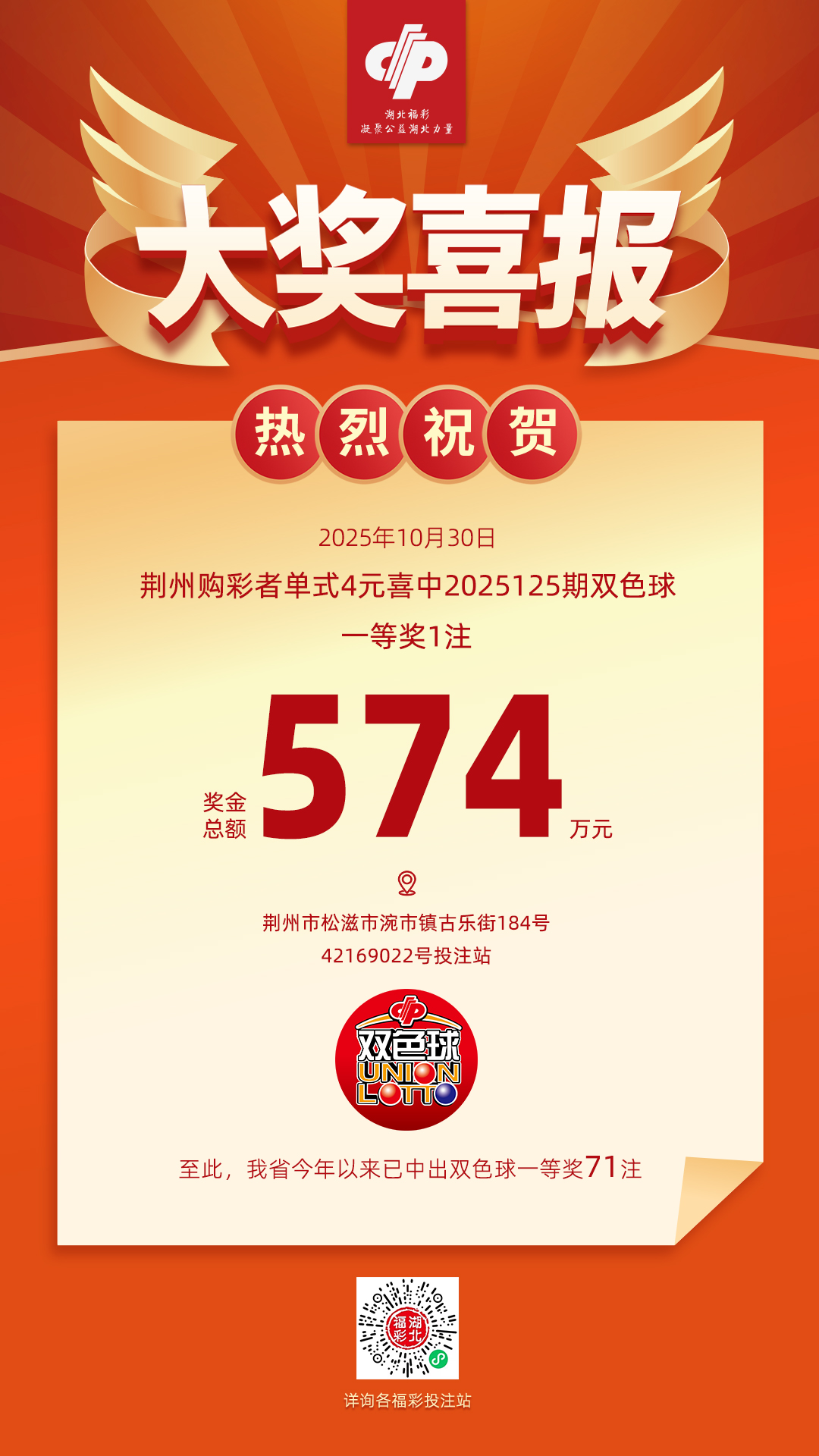 热烈祝贺我省彩民喜中2025125期双色球一等奖1注,大奖出荆州市松滋市涴市镇古乐街184号,42169022号投注站,奖金总额为574万元。至此,我省2025年共中出双色球一等奖71注。