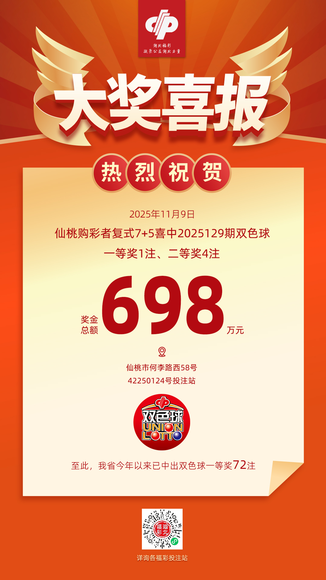 热烈祝贺我省彩民喜中2025129期双色球一等奖1注、二等奖4注,大奖出仙桃市何李路西58号,42250124号投注站,奖金总额为698万元。至此,我省2025年共中出双色球一等奖72注。