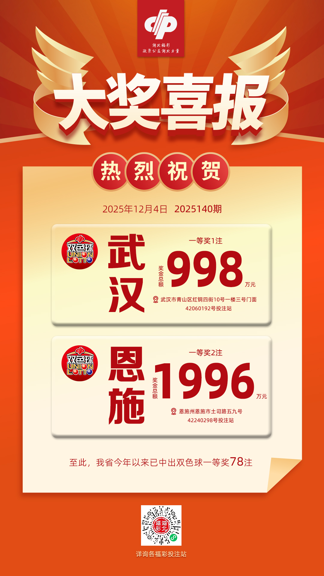 热烈祝贺我省彩民喜中2025140期双色球一等奖3注,大奖分别出自武汉市青山区红钢四街10号一楼三号门面,42060192号投注站,奖金总额为998万元;恩施州恩施市土司路五九号,42240298号投注站,奖金总额为1996万元。至此,我省2025年已中出双色球一等奖78注。