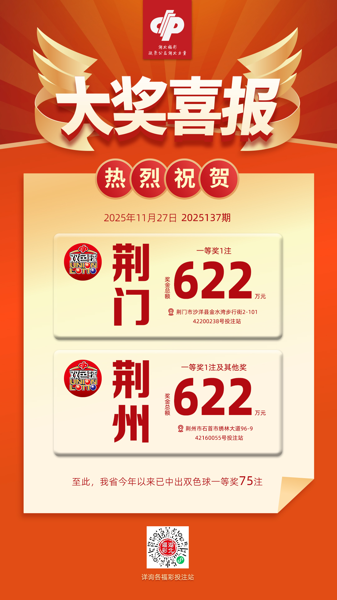至此,我省2025年已中出双色球一等奖75注。