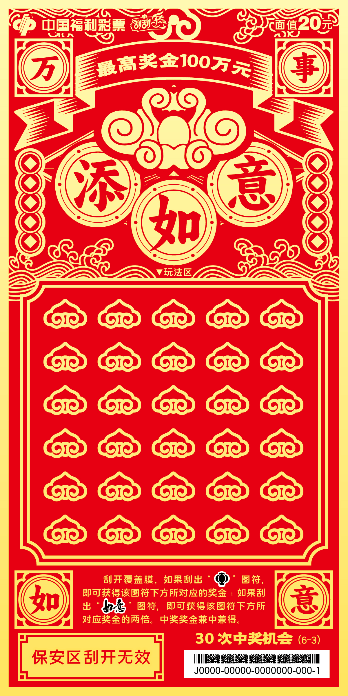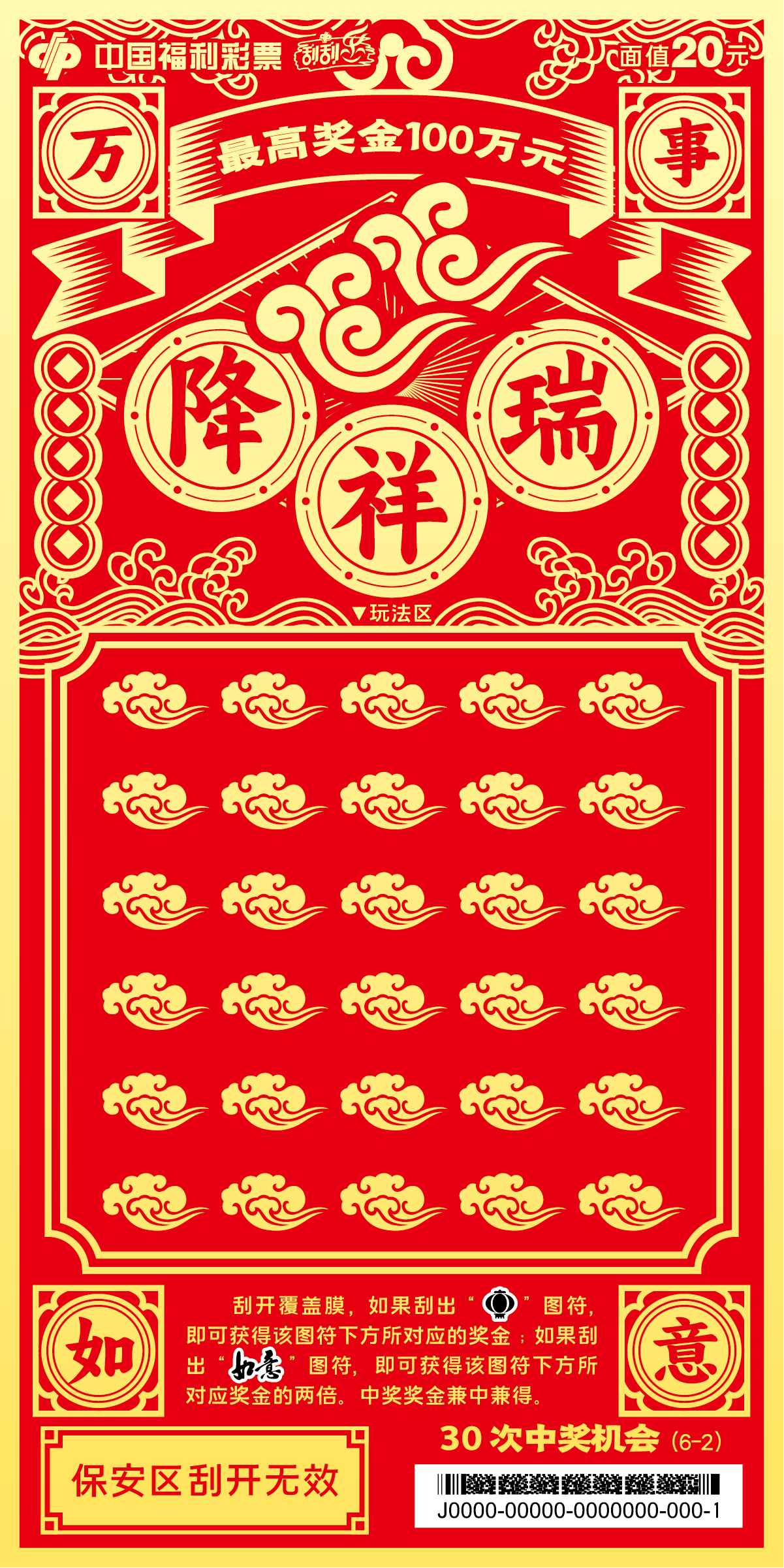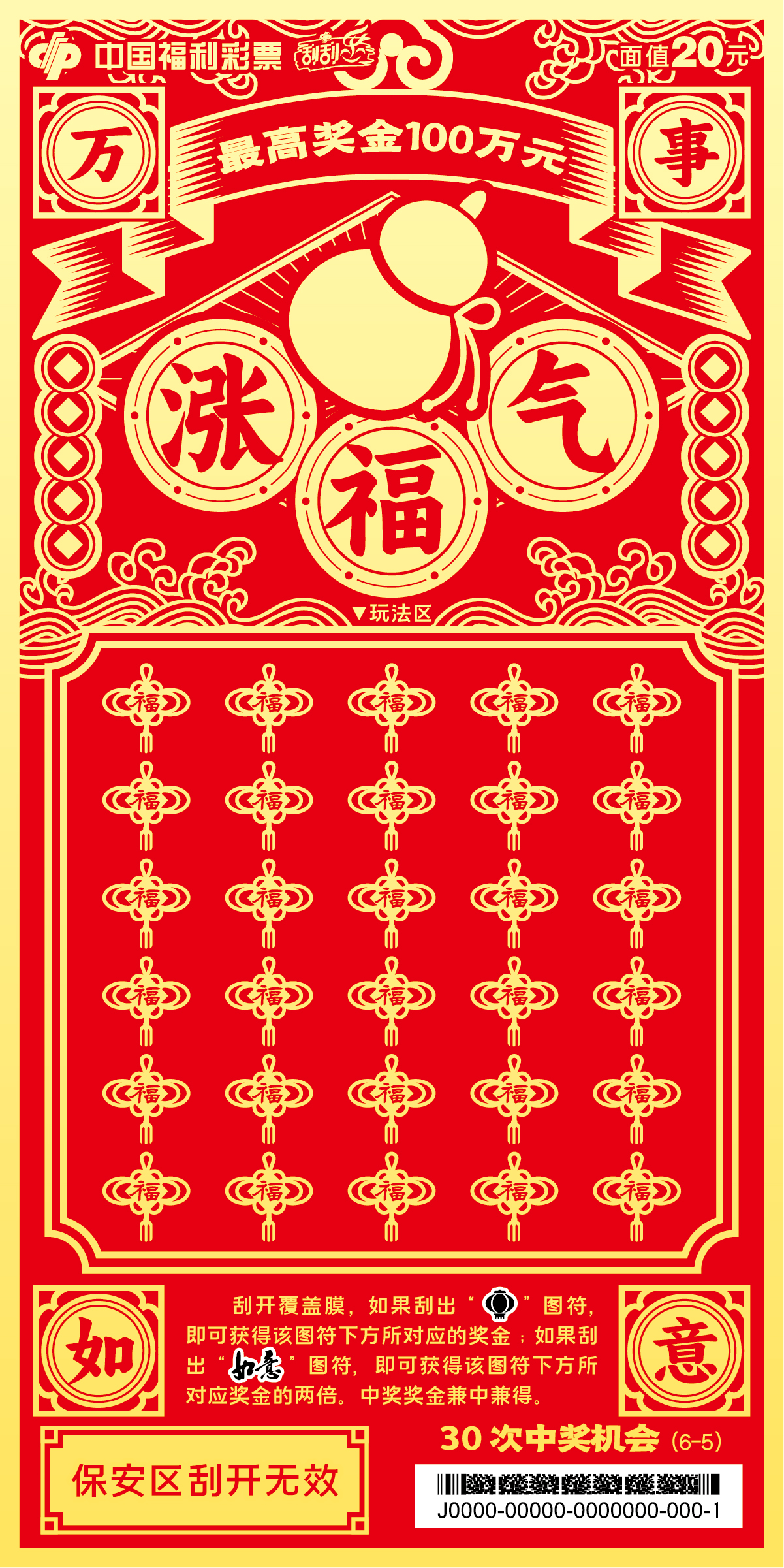 玩法:刮开覆盖膜,如果刮出“灯笼”图符,即可获得该图符下方所对应的奖金;如果刮出“如意”图符,即可获得该图符下方所对应奖金的两倍。中奖奖金兼中兼得。