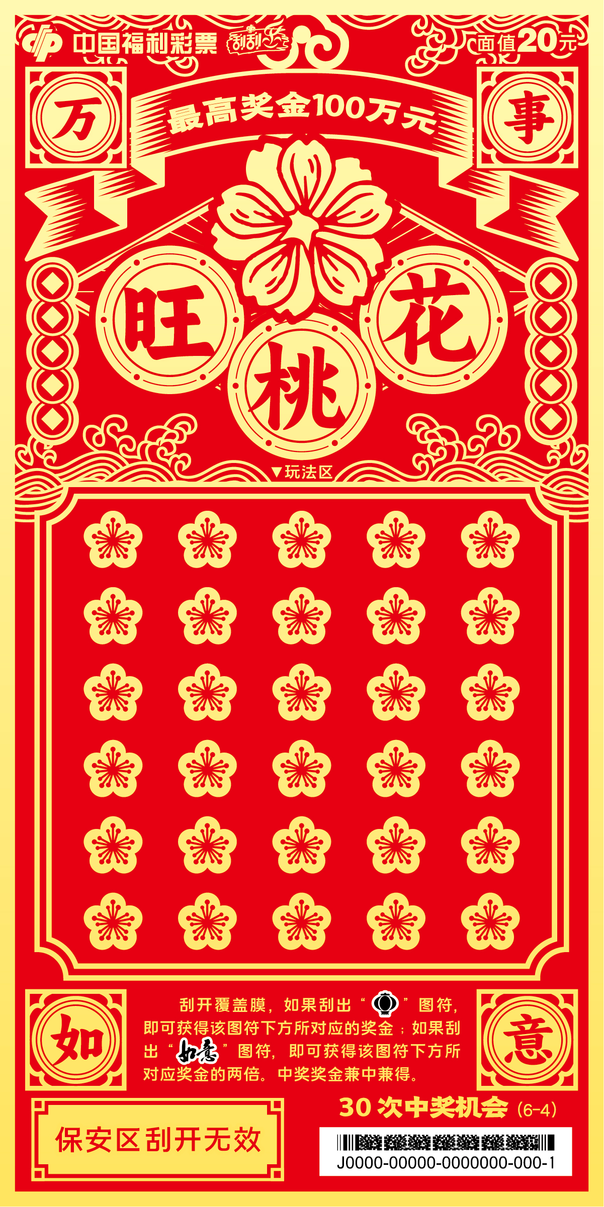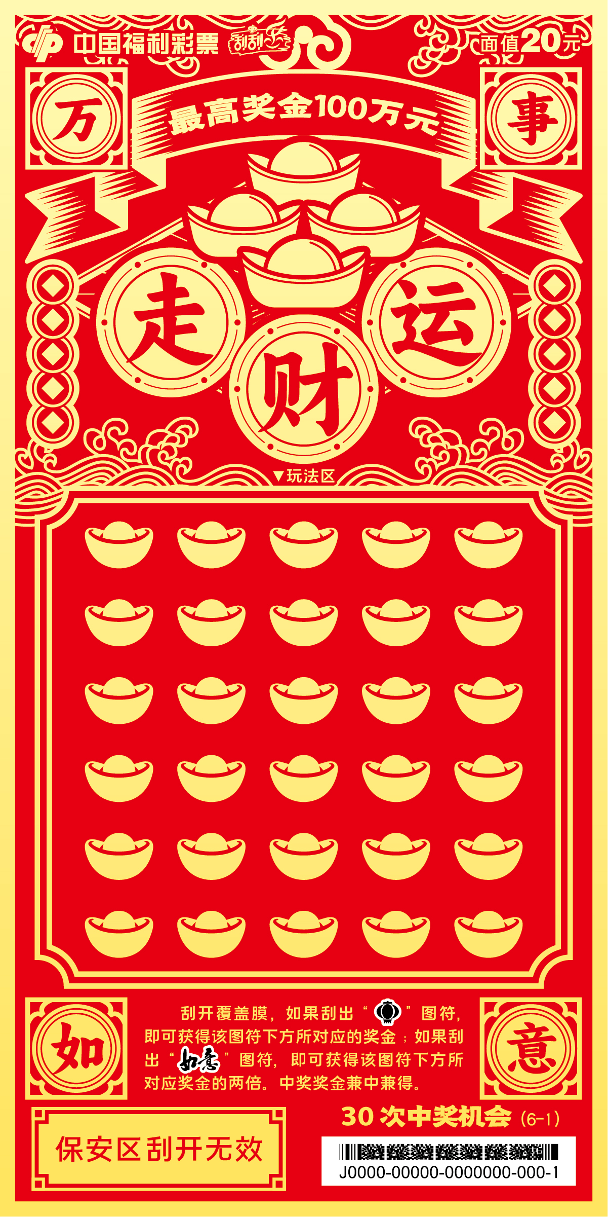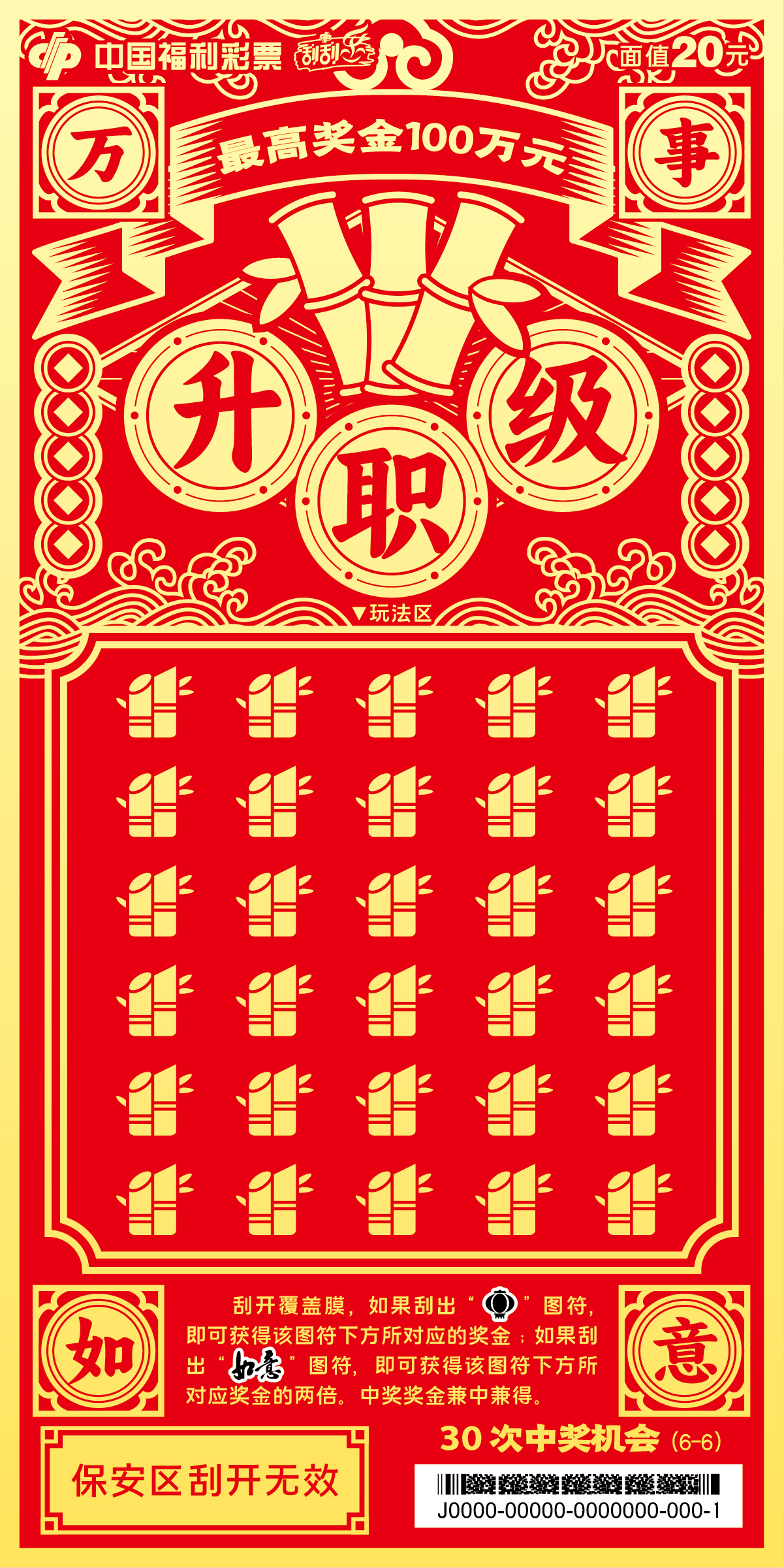 玩法:刮开覆盖膜,如果刮出“灯笼”图符,即可获得该图符下方所对应的奖金;如果刮出“如意”图符,即可获得该图符下方所对应奖金的两倍。中奖奖金兼中兼得。