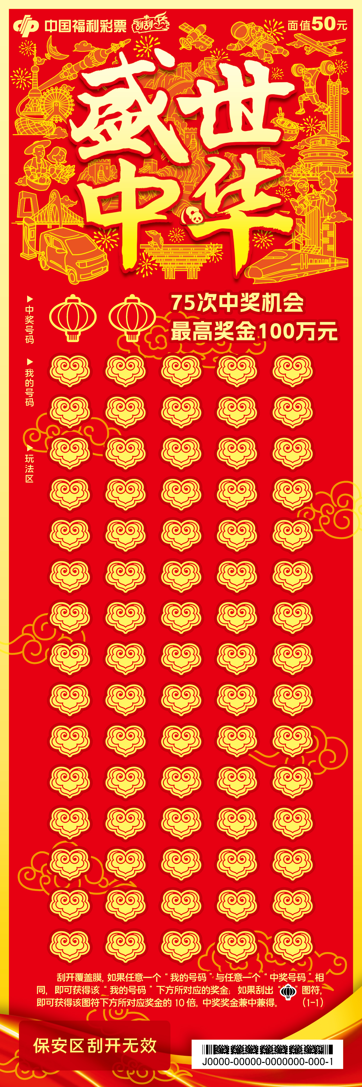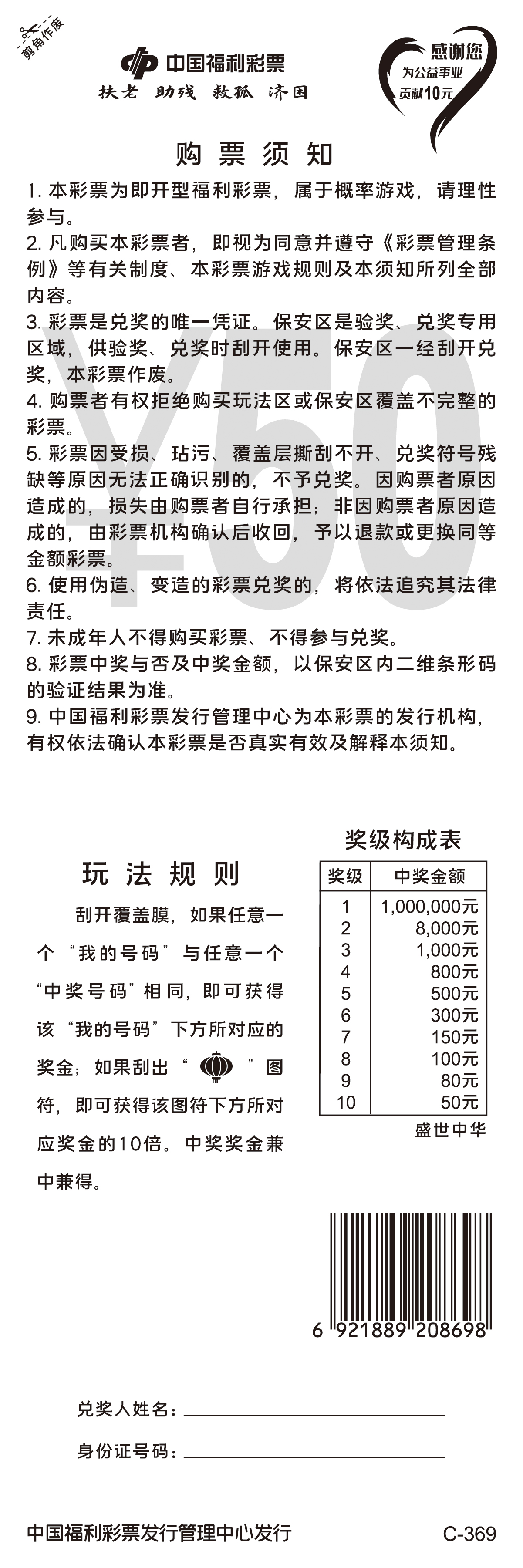 玩法:刮开覆盖膜,如果任意一个“我的号码”与任意一个“中奖号码”相同,即可获得该“我的号码”下方所对应的奖金;如果刮出“灯笼 ”图符,即可获得该图符下方所对应奖金的10倍。中奖奖金兼中兼得。