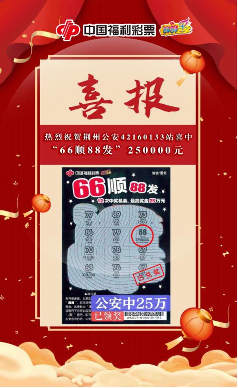 3月22日,荆州公安县瓦池湾街道42160133号站中出福彩刮刮乐“66顺88发”头奖,奖金25万元。