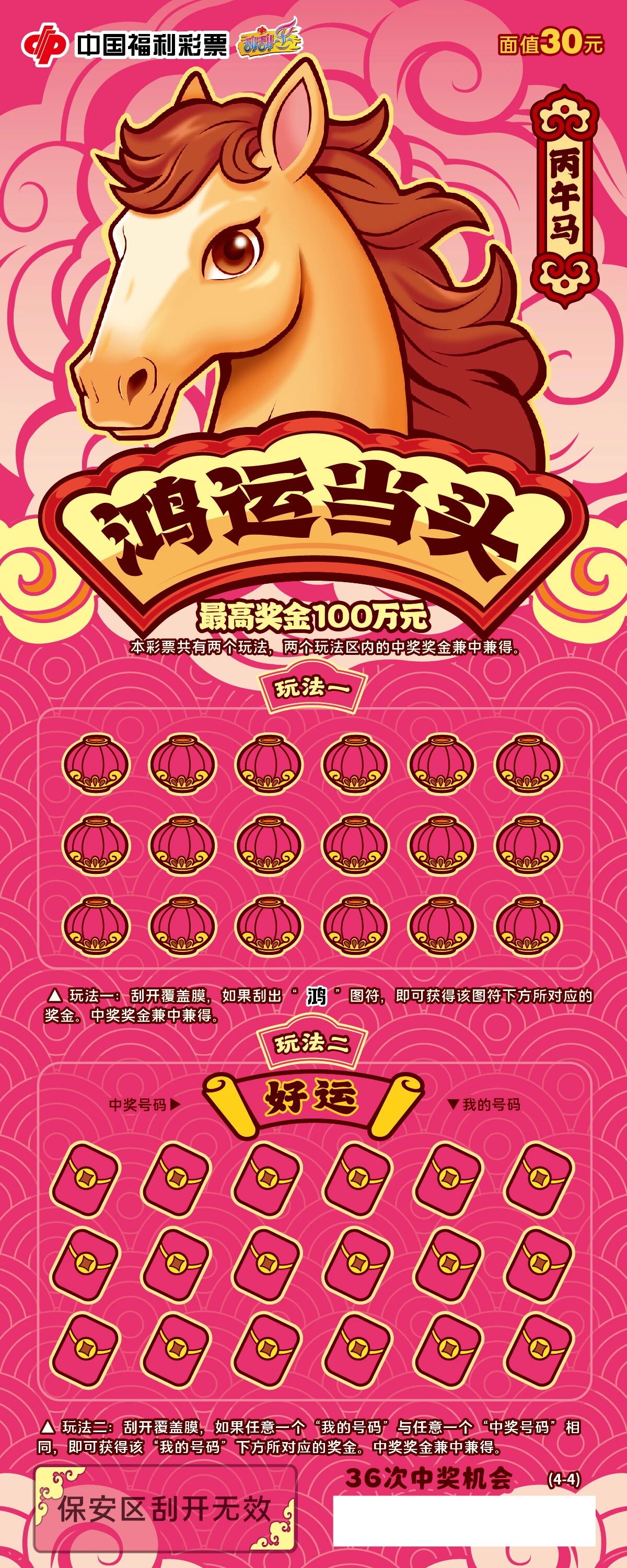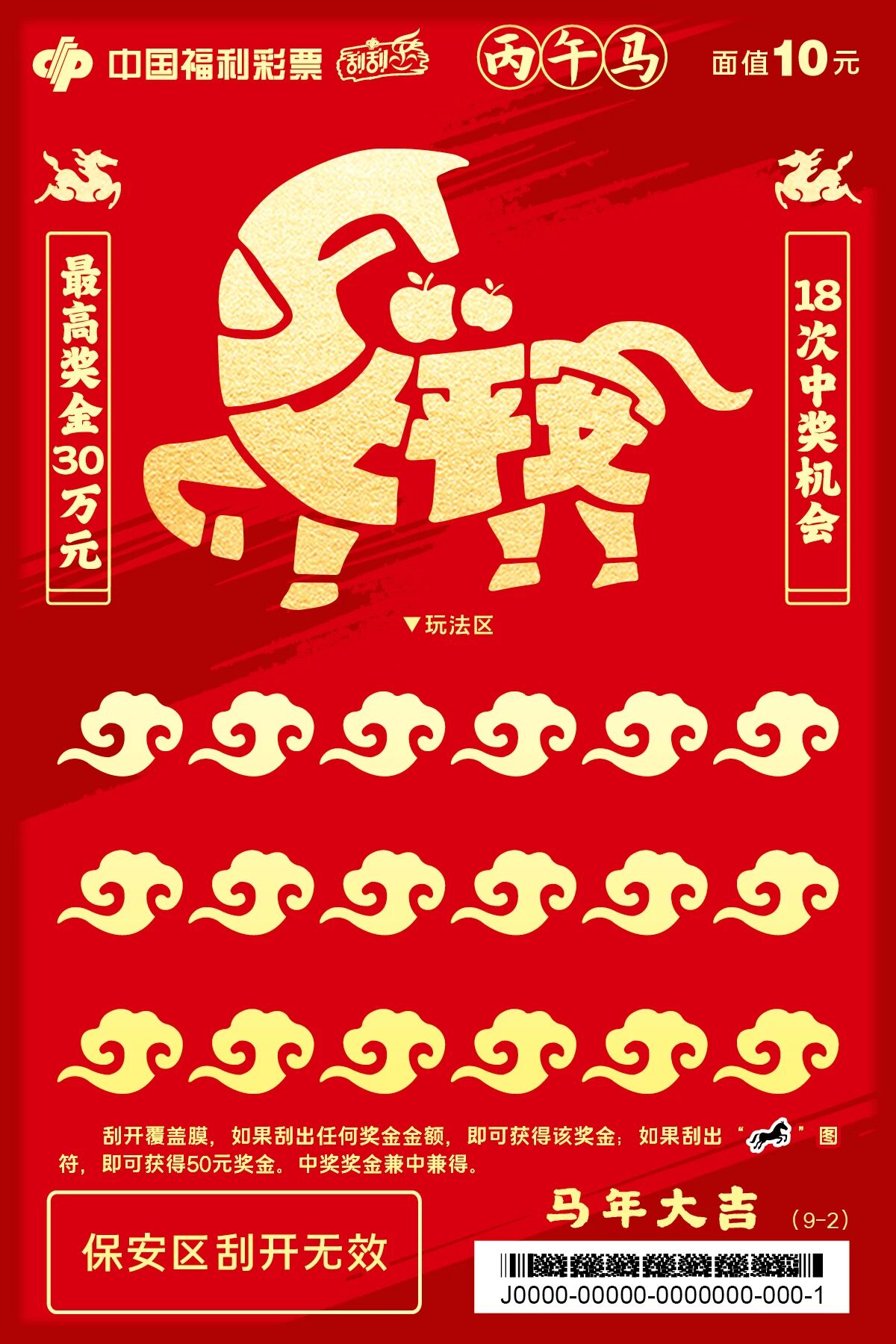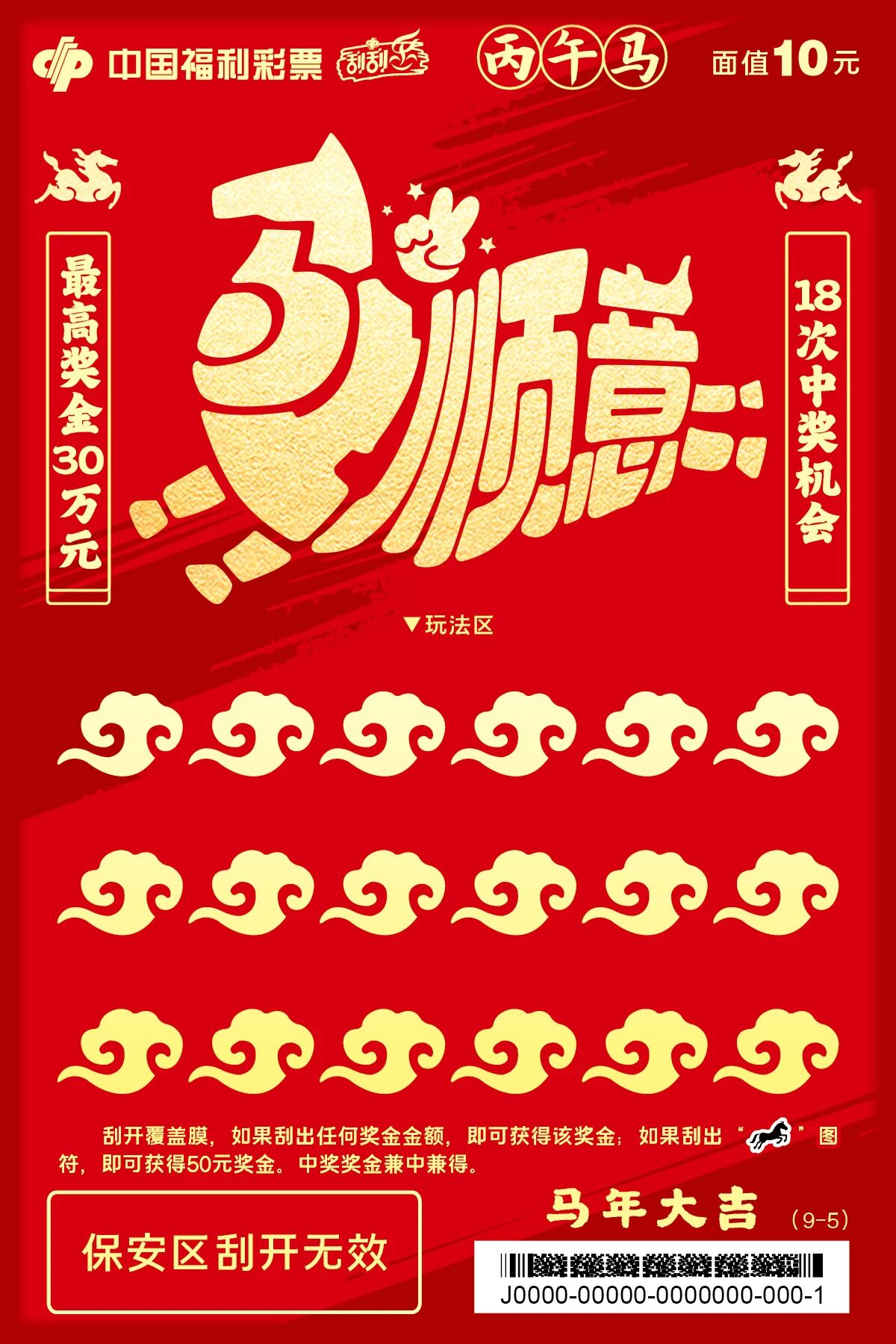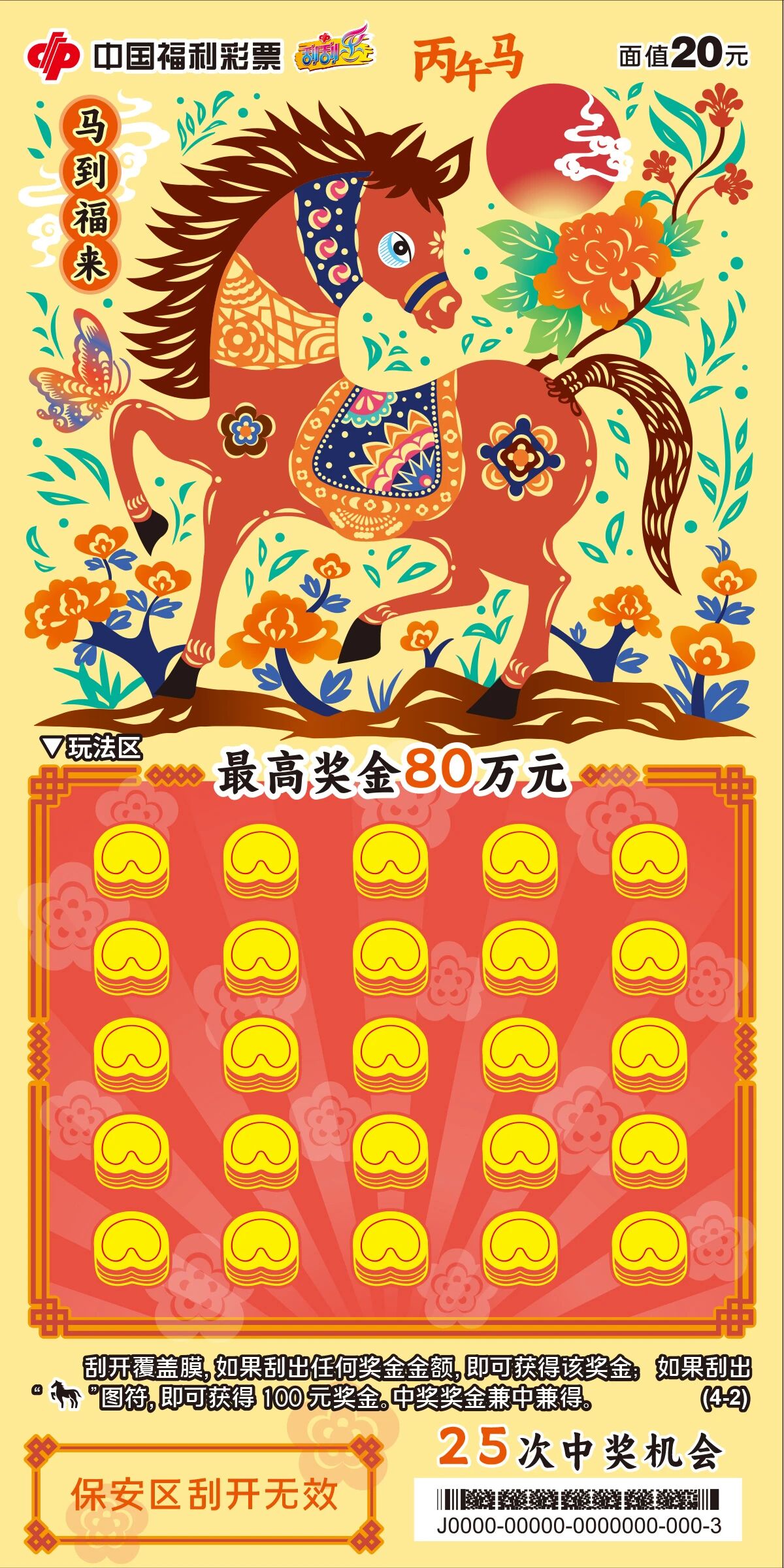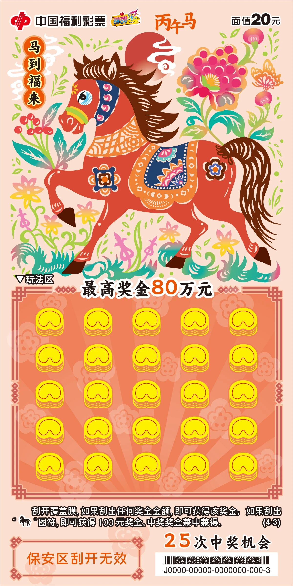 20元面值的“马到福来”系列以传统剪纸为灵感。骏马踏花前行,刮开区设计成“马蹄金”样式,既呼应主题,也有“马上得金”的吉祥寓意。