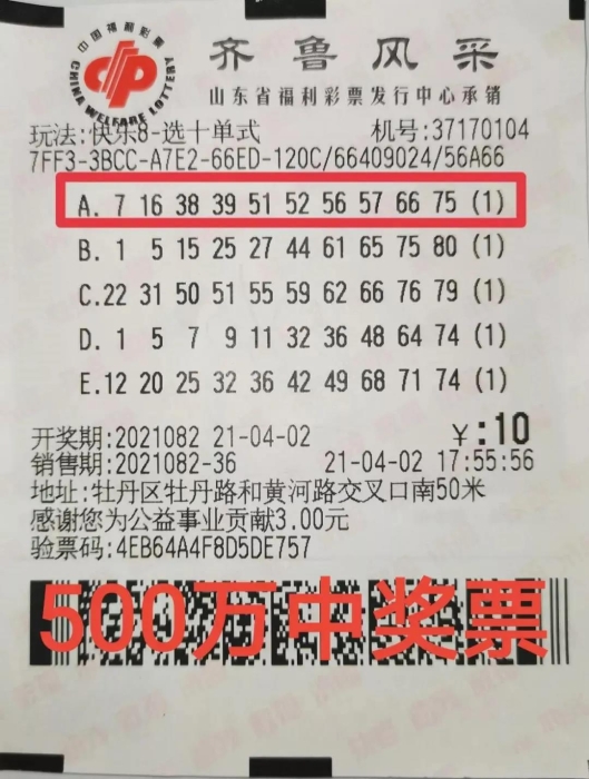 4月2日晚,中国福利彩票快乐8游戏第2021082期开奖,全国开出4注“选十中十”500万大奖,山东喜获其中1注,大奖花落菏泽市牡丹区牡丹路与黄河路交叉口南50米37170104号福彩站,中奖彩票为一张10元选十机选票。