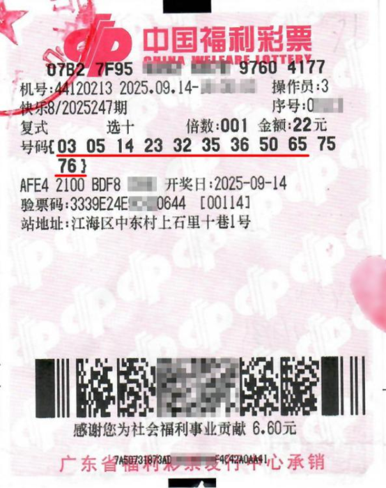 9月14日,中国福利彩票快乐8游戏第2025247期开奖,当期全国中出“选十中十”1注,花落江门市江海区中东村上石里十巷的44120213福彩销售站点,中奖彩票是一张投注金额为22元的选十玩法复式彩票,中奖奖金508万元。