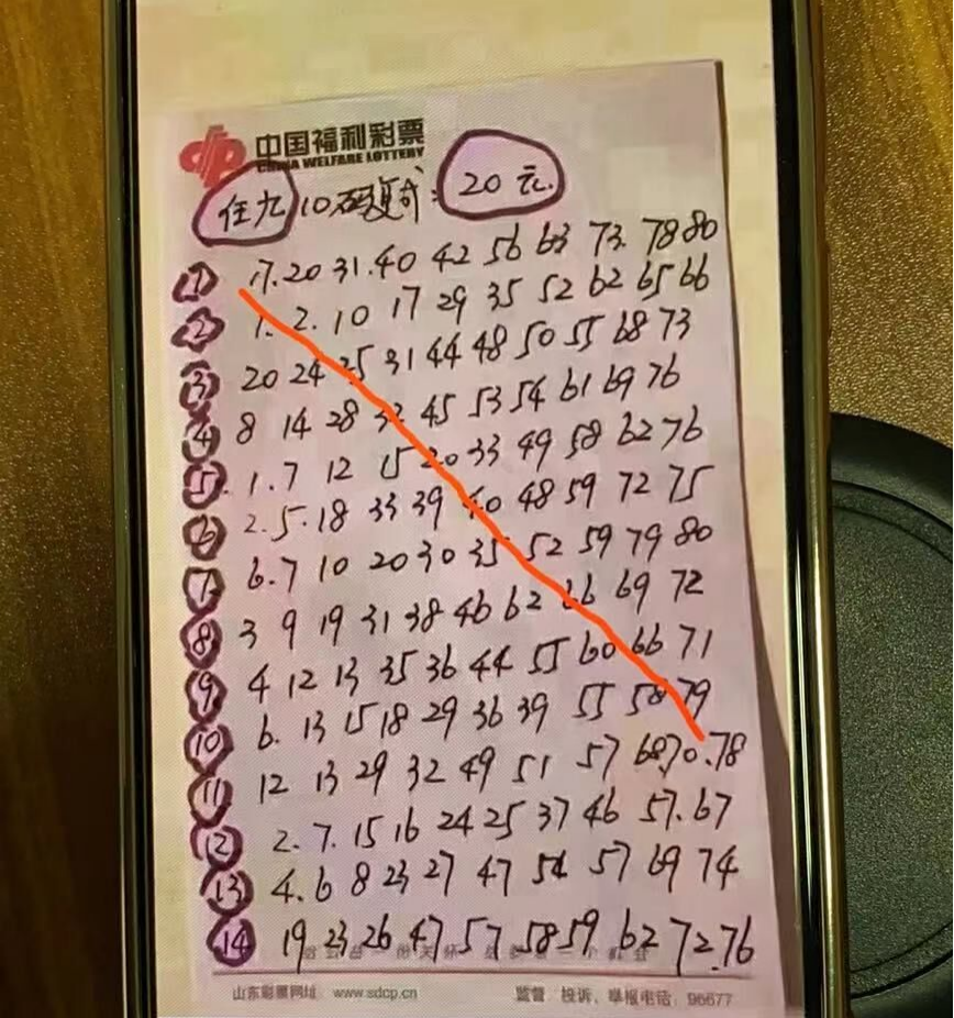 小方从第一个号码开始,划出一条斜线,然后将斜线上的11个号码全部挑选出来,又另外添加了两个心仪的号码做备用。面对挑选出来的13个号码,他按平时投注11码“选9中9”的模式,最后又随意删除了两个,并将剩下的11个号码进行了“选9中9”复式投注。