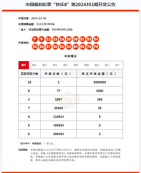 12月30日晚,中国福利彩票快乐8游戏进行第2024351期开奖。当期快乐8开奖号码为07、09、12、15、16、28、29、31、33、34、35、36、37、38、43、44、64、69、76、79。