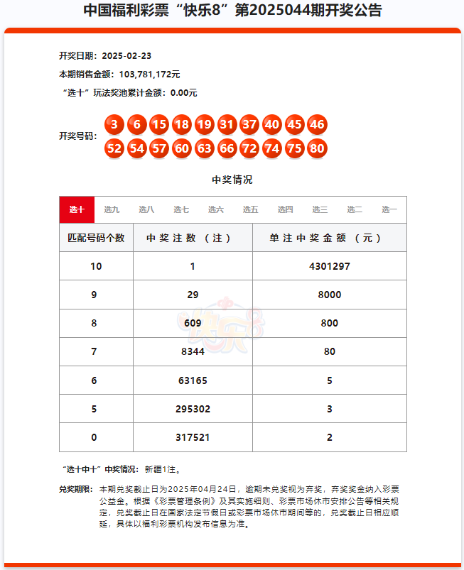 02月23日晚,中国福利彩票快乐8游戏进行第2025044期开奖。当期快乐8开奖号码为03、06、15、18、19、31、37、40、45、46、52、54、57、60、63、66、72、74、75、80。