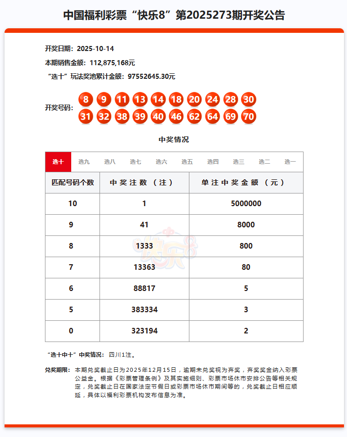 【快乐8大奖速递】20250273期选十中十奖1注500万元