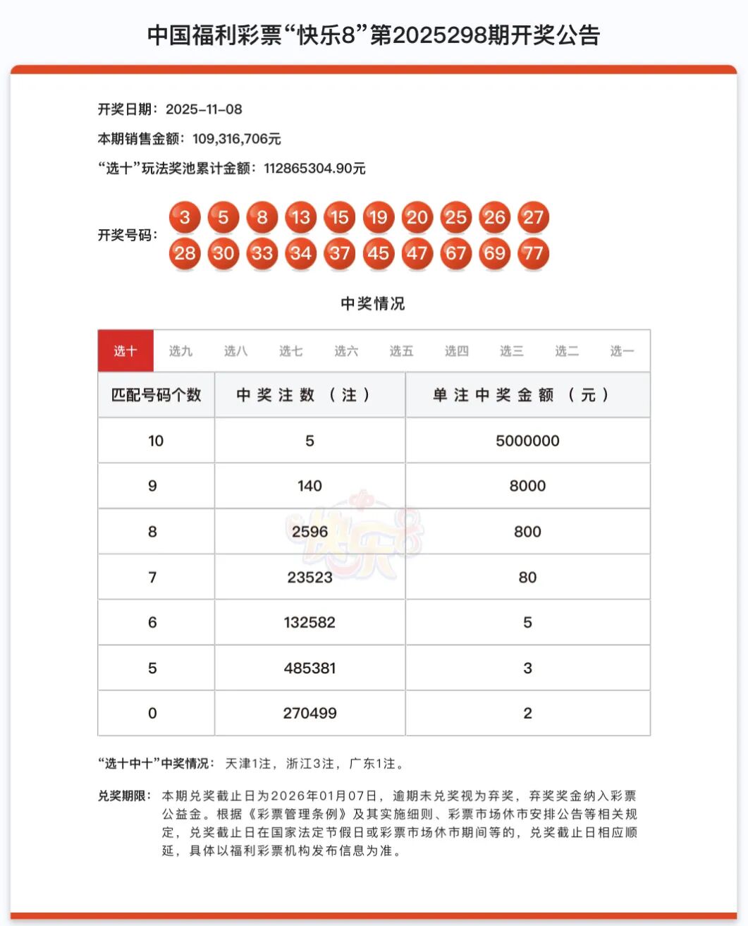 【快乐8大奖速递】20250298期选十中十奖5注500万元