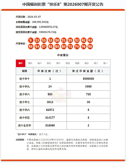 【快乐8大奖速递】2026007期选十中十奖1注500万元