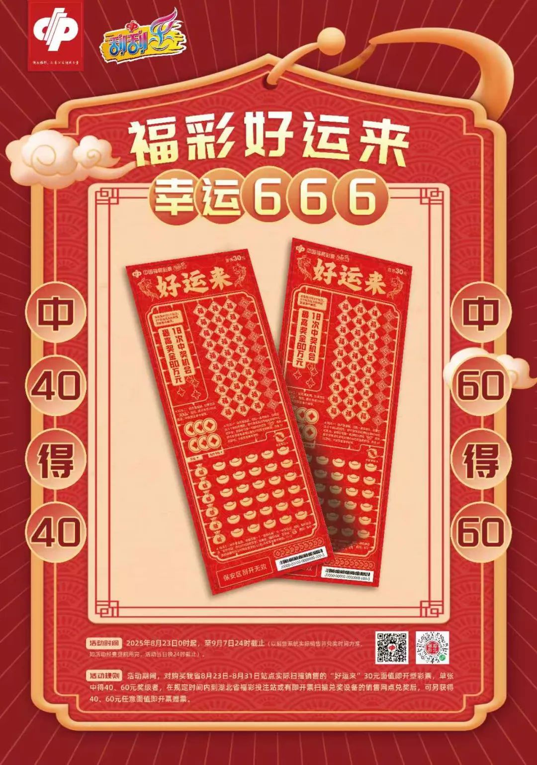 (一)活动期间,对购买我省8月23日-8月31日期间站点实际扫描销售的“好运来”30元面值即开型彩票,单张中得40、60元奖级者,在规定时间内到湖北省福彩投注站或有即开票扫描兑奖设备的销售网点兑奖后,可另获得40、60元任意面值即开票赠票。