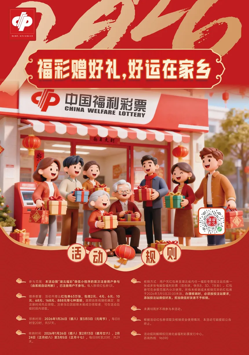 2026年1月26日(腊八)至3月3日(元宵节),湖北福彩派发总额300万元红包券,凭红包券至湖北省内任一福彩专营投注站兑换一张或多张电脑型福利彩票(双色球、快乐8、3D、7乐彩)。